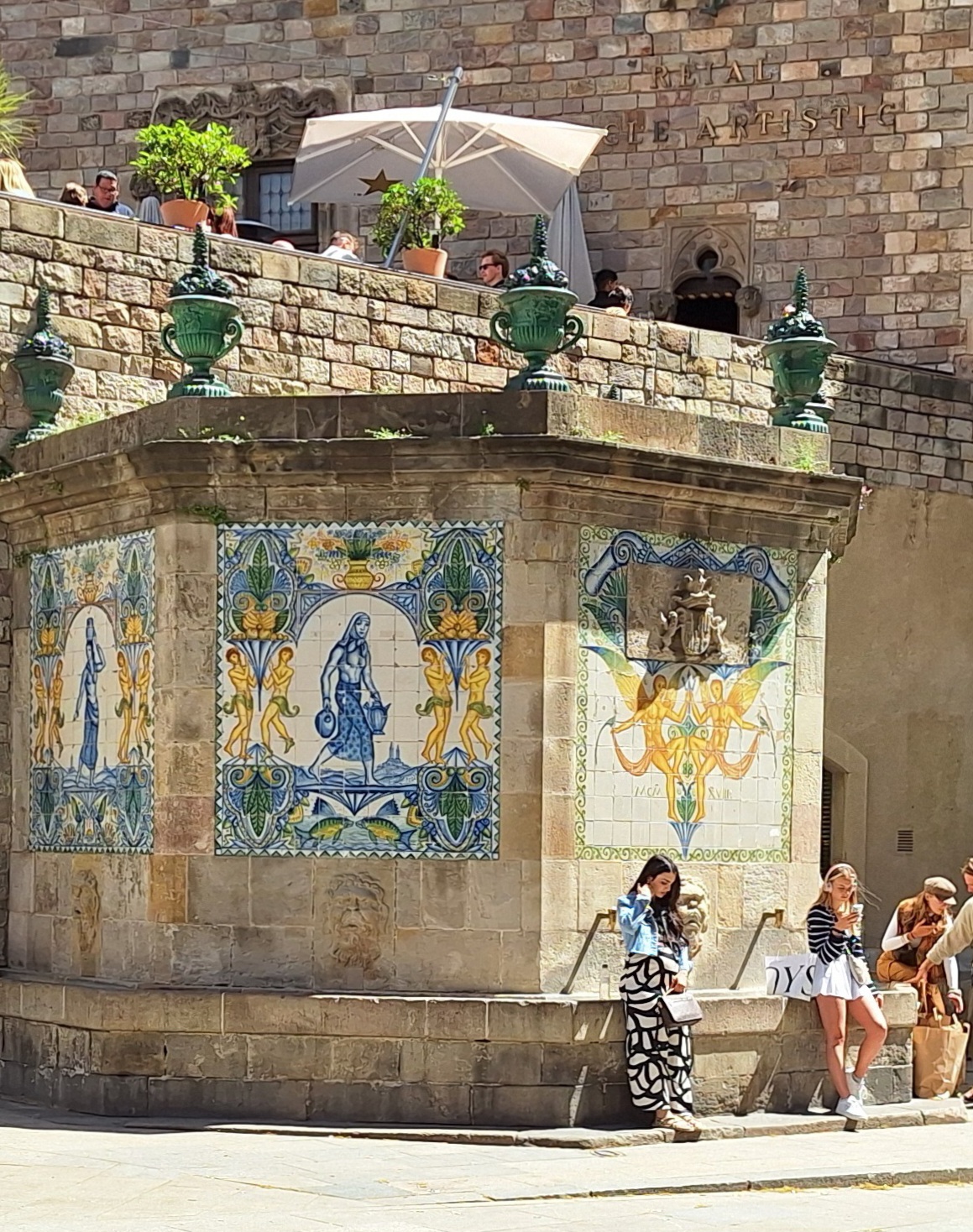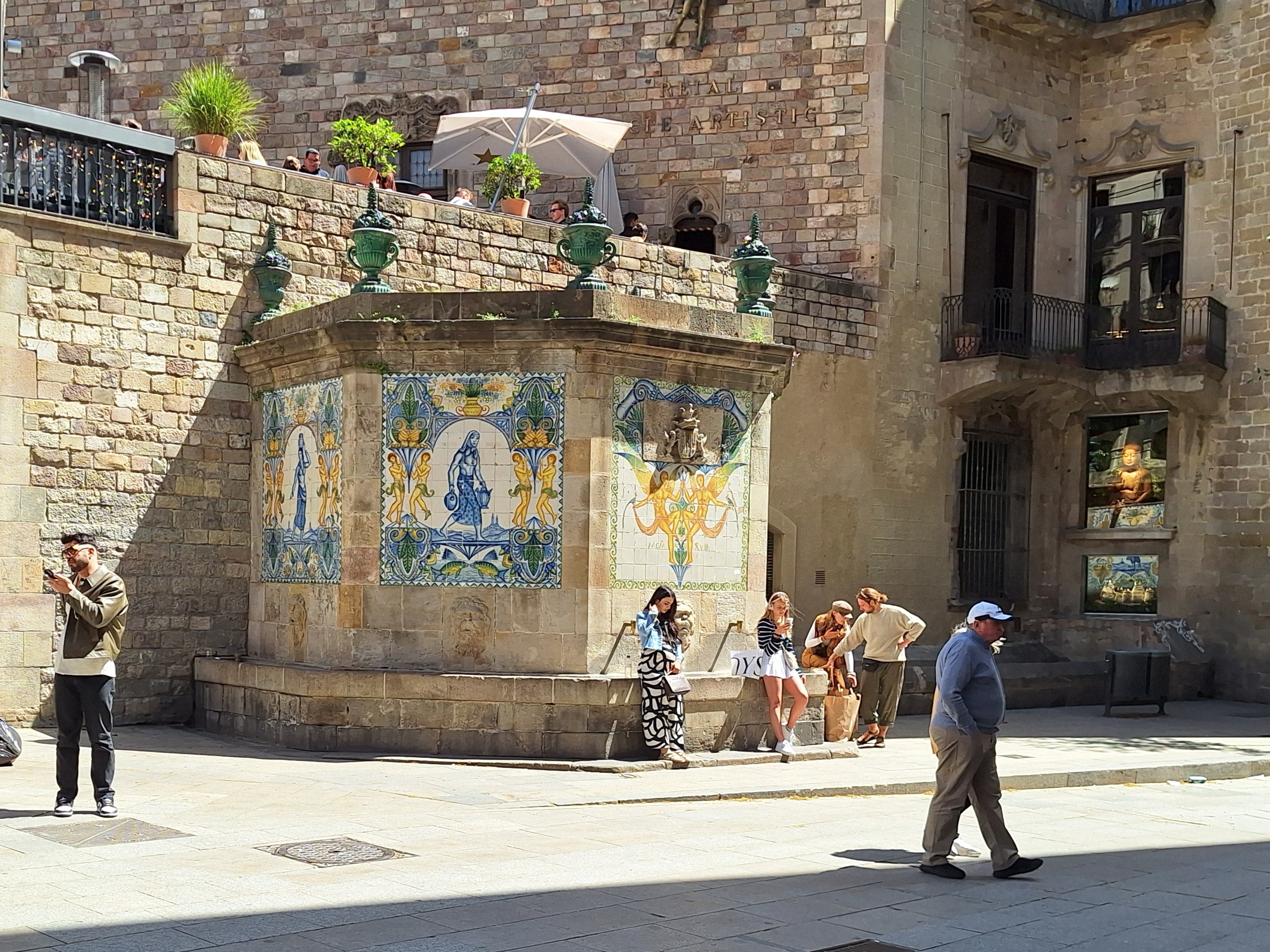 Dieser Brunnen hat bereits so manche Epoche miterlebt. Er wurde 1356 errichtet, um das Viertel mit Wasser zu versorgen, und ist damit der dienstälteste seiner Art in ganz Barcelona. Er hat sich erstaunlich gut gehalten, was sicher auch an den diversen Schönheitsoperationen liegt, die er über die Jahrhunderte erfahren durfte. Sein heutiges farbenfrohes Kachelkleid verdankt er einer Generalüberholung aus dem Jahr 1918. Man kann ihn also getrost als einen Methusalem der Wasserversorgung bezeichnen, der heute sicher deutlich dekorativer aussieht als im tiefsten Mittelalter.