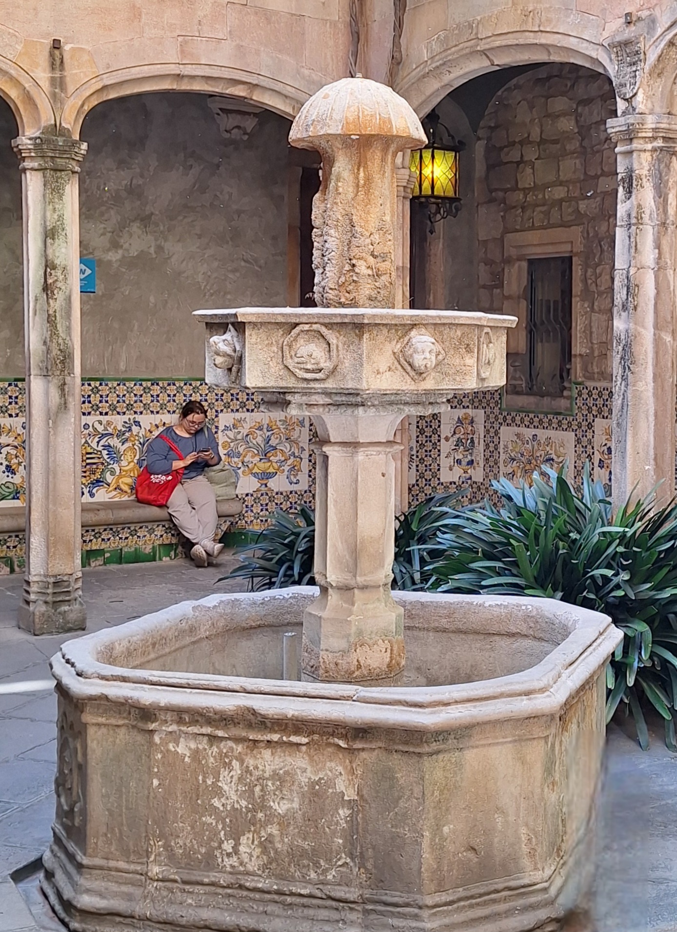 Der Brunnen liegt zwar an einer der belebtesten Einkaufsstraßen der Stadt, aber während Tausende von Menschen mit Einkaufstüten am Portal de l'Àngel vorbeieilen, bietet der Brunnen und die direkt dahinter liegende Gasse zur Kirche überraschenderweise einen echten Moment historischer Stille in dieser Gegend.