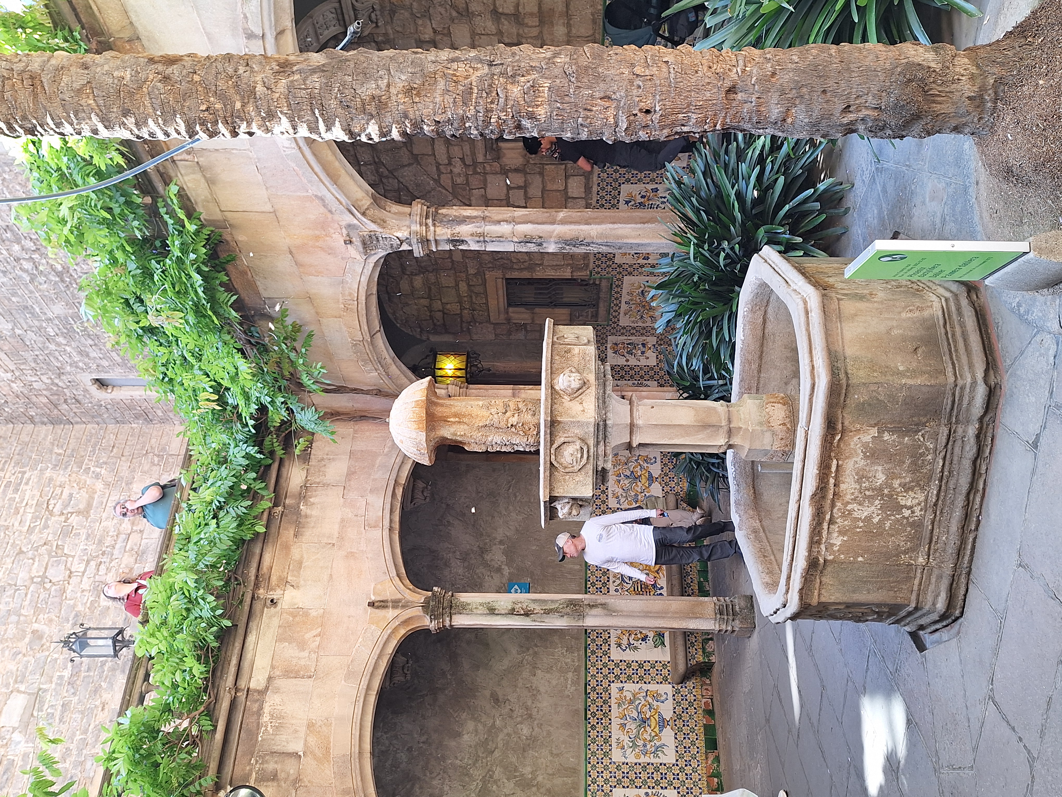 Ich schlängele mich weiter durch den Touristenstrom der Carrer del Bisbe. Um auf dem kürzesten Weg zur Plaçeta de la Seu zu gelangen, biege ich in die Carrer de Santa Llúcia ab. Vor einem Gebäude auf der linken Seite entdecke ich eine Rampe; durch die offene Tür fällt mein Blick auf einen Brunnen und eine Palme.