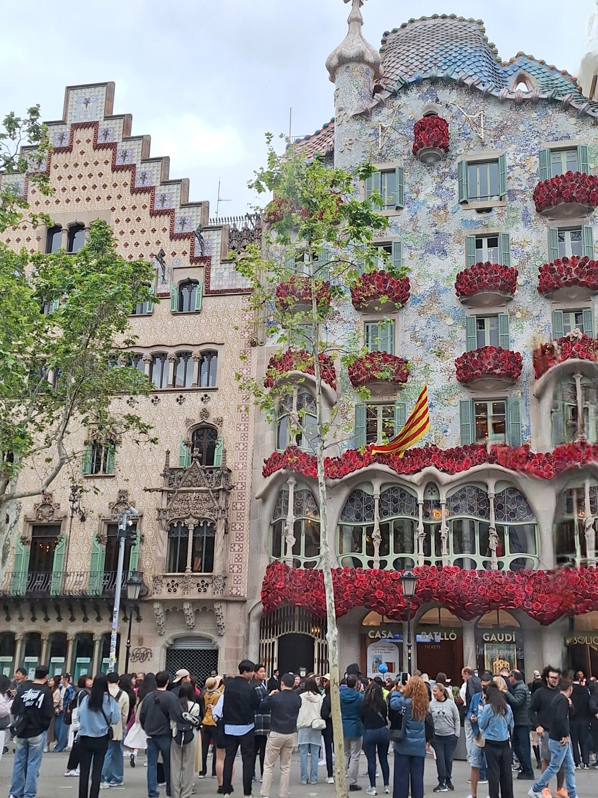 Mein erster Halt gilt der Casa Batlló. Kaum ausgestiegen, stehe ich auch schon mitten unter staunenden Besuchern. Der Versuch, das Gebäude fotografisch zu bändigen, gestaltet sich schwierig. Von der anderen Straßenseite aus hätte man zwar den besten Winkel, doch da die Haltestellen aller Buslinien direkt vor der Casa liegen und die Taktung gerade jetzt enorm ist, schiebt sich ständig eines dieser Blechmonster ins Bild.