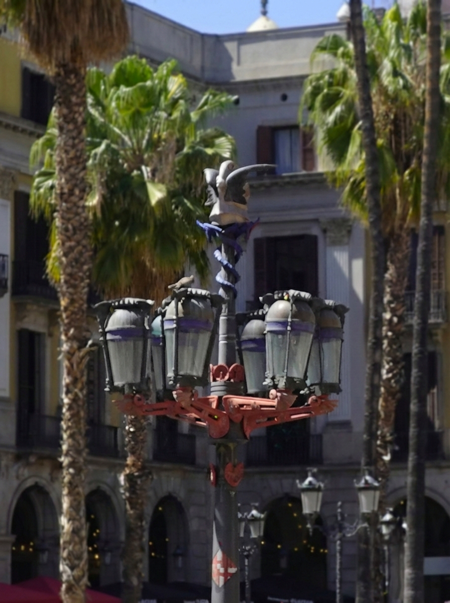 Die meisten Besucher kommen jedoch wegen zweier Laternen. Es sind die Erstlingswerke eines gewissen Antoni Gaudí. 1878 war der Mann jung, unbekannt und – man kennt das – chronisch knapp bei Kasse. Die Stadt gab ihm seinen ersten öffentlichen Auftrag: Entwürfe für die Beleuchtung der Plaça Reial.
