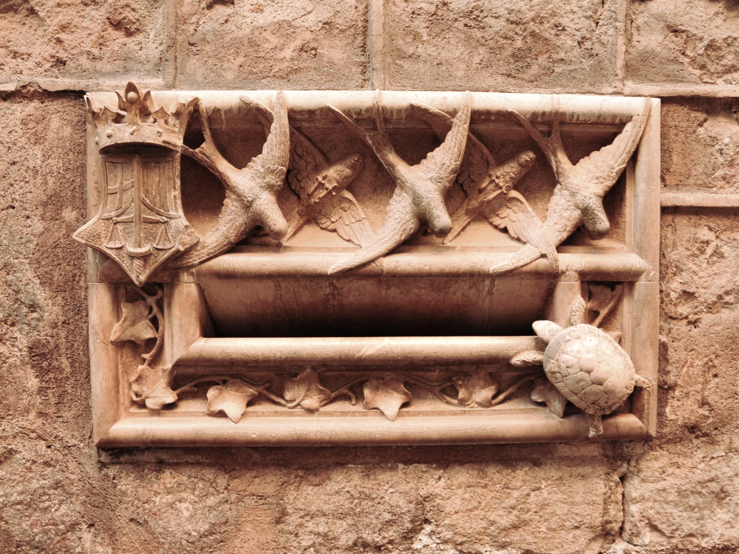 So konnte ich doch tatsächlich noch den berühmten Briefkasten an der Fassade aus dem Foto herauszoomen. Die Symbolik ist so legendär wie aktuell. Als Anfang des 20. Jahrhunderts die Anwaltskammer in die Casa de l’Ardiaca einzog, konnte sich der Architekt Lluís Domènech i Montaner einen architektonischen Seitenhieb nicht verkneifen. Er meißelte fünf Schwalben in den Marmor, sozusagen als optimistisches Symbol für die Freiheit und jene flinke Justiz, von der wir alle träumen. Direkt darunter jedoch platzierte er eine Schildkröte, die sich als steinerne Fleischwerdung einer Bürokratie im Zeitlupentempo durch die Aktenberge frisst. Umrahmt wird das Ganze von kunstvollen Ranken, die uns sanft daran erinnern, dass man sich im Dickicht der Paragraphen schneller verfängt, als einem lieb ist. Hat sich daran bis heute etwas geändert? Ich sage mal so: Die Schwalben fliegen immer noch, aber die Schildkröte hat inzwischen wahrscheinlich eine unbefristete Festanstellung.