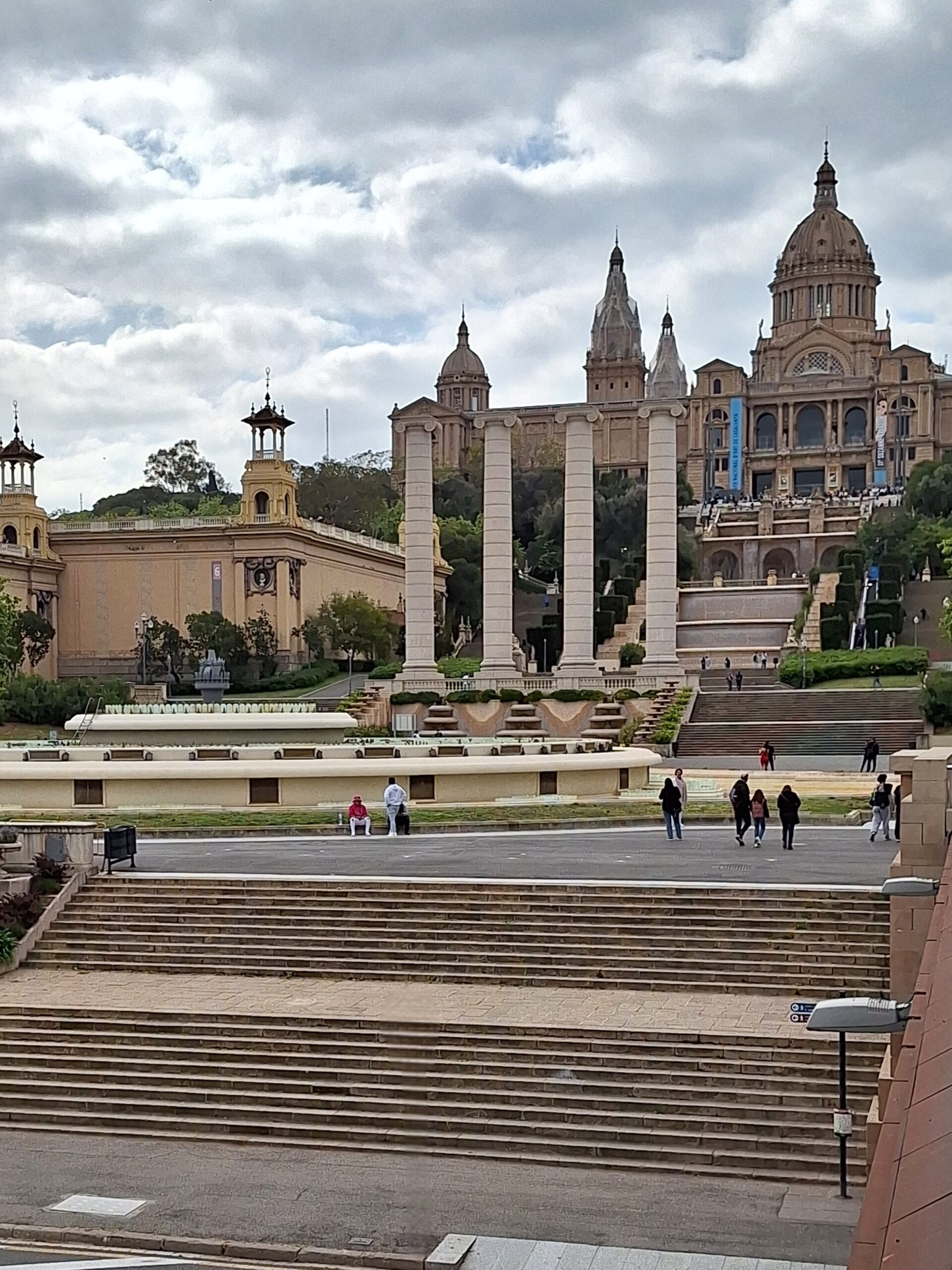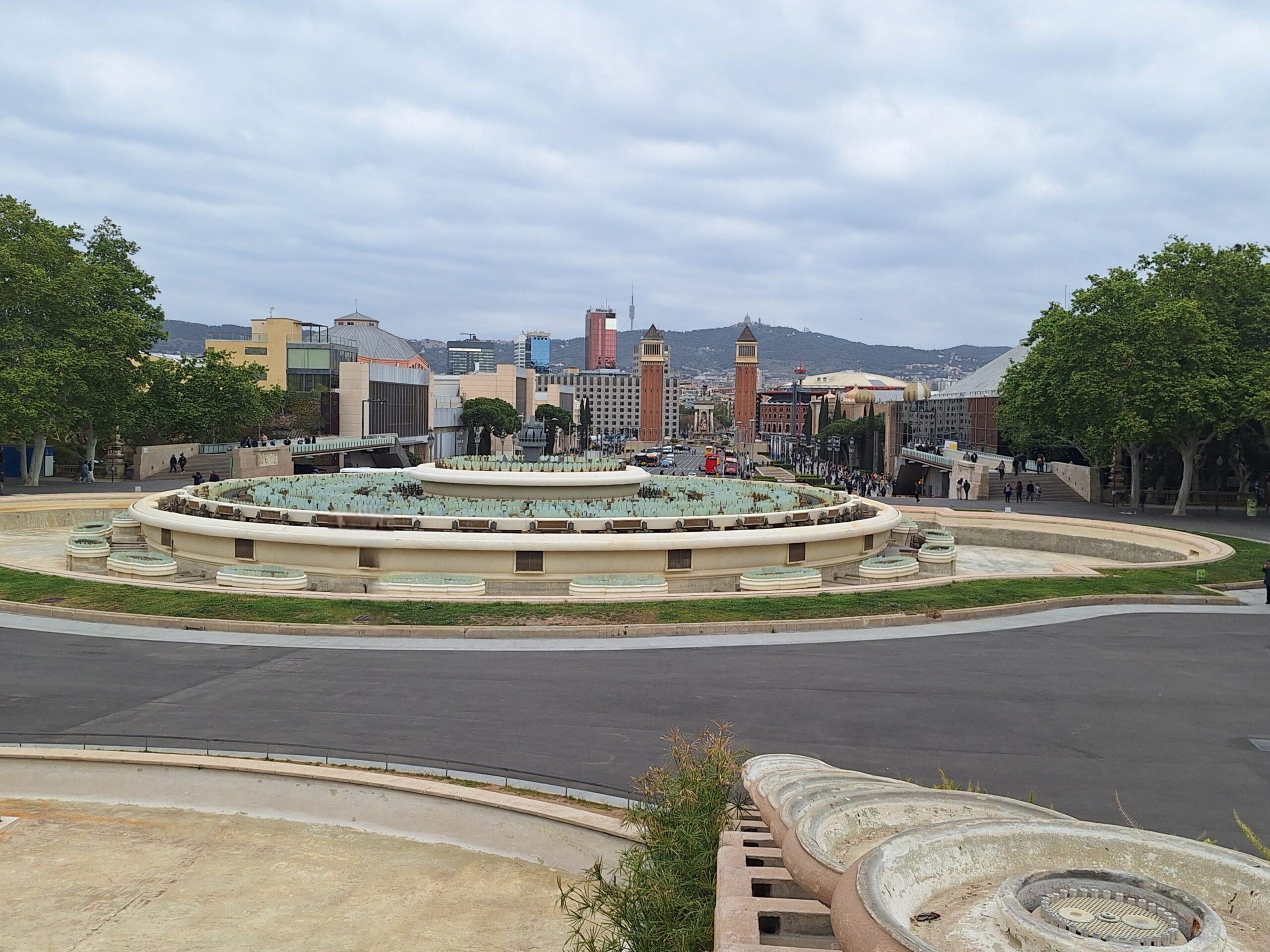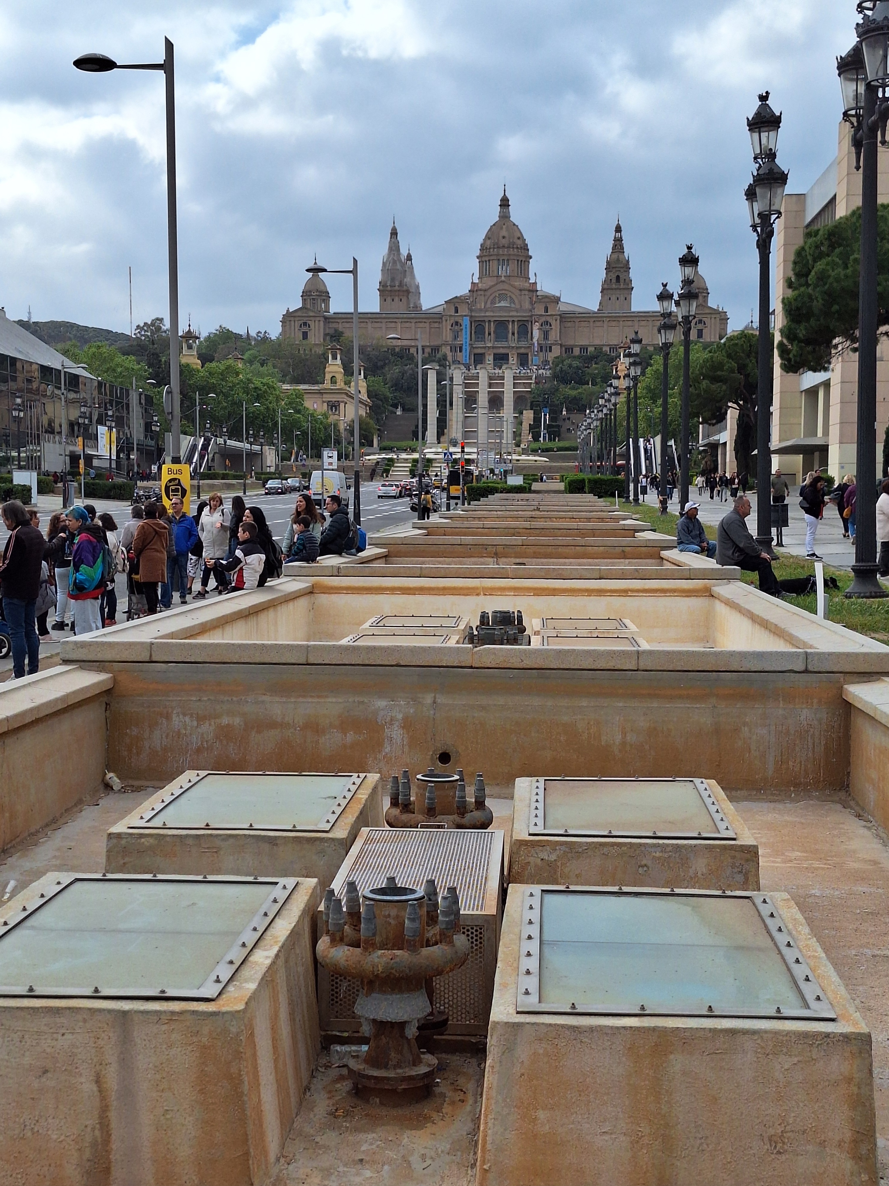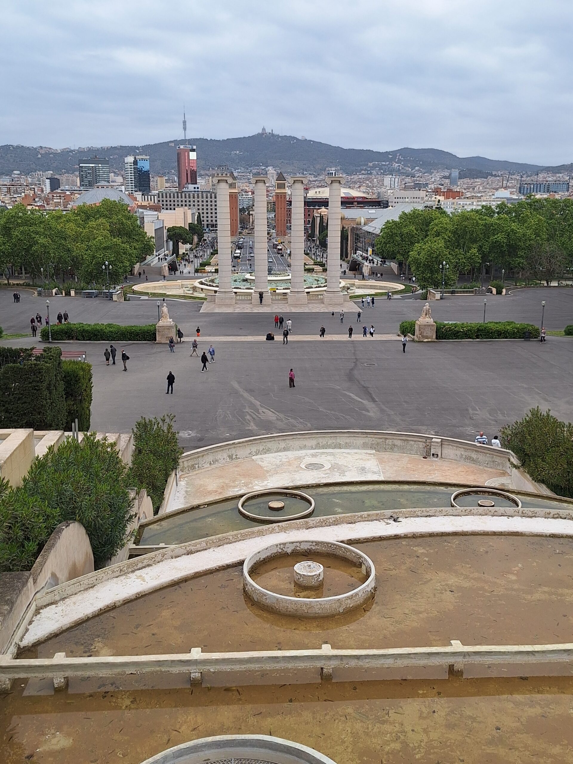 Dabei schaut man unweigerlich auf die weitläufigen Becken und Wasserbassins, die sich oben vom MNAC bis hinunter zu den Venezianischen Türmen erstrecken. Nur, es fehlt das Wasser.