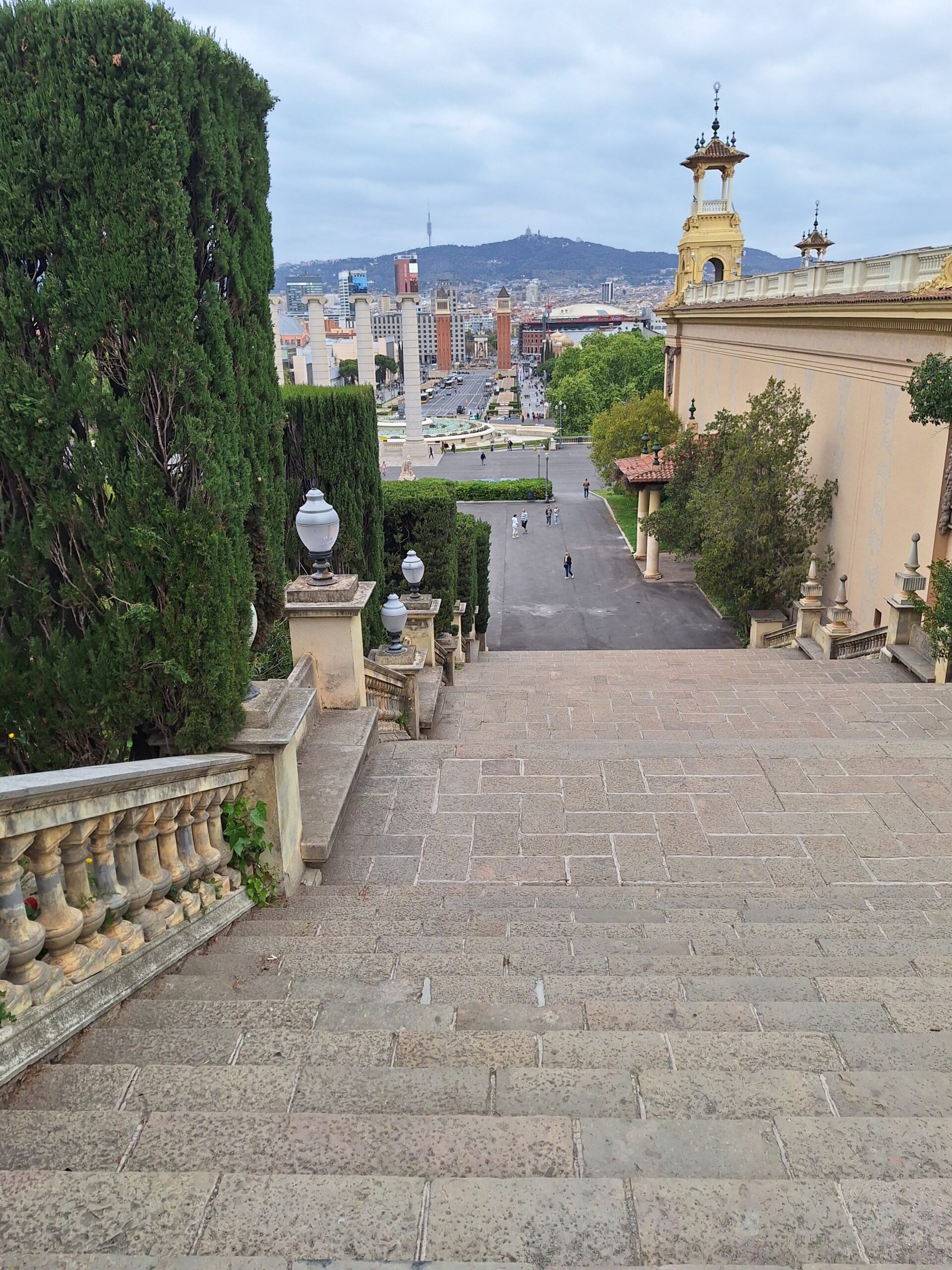 Doch die wahre Entschädigung wartet draußen. Ich drehe mich um, und plötzlich verblasst der Treppen-Frust. Barcelona liegt mir zu Füßen. Der Blick gleitet über die Kaskaden – die mangels Wasser zurzeit eher wie steinerne Treppenwitze wirken – bis hin zum fernen Tibidabo.