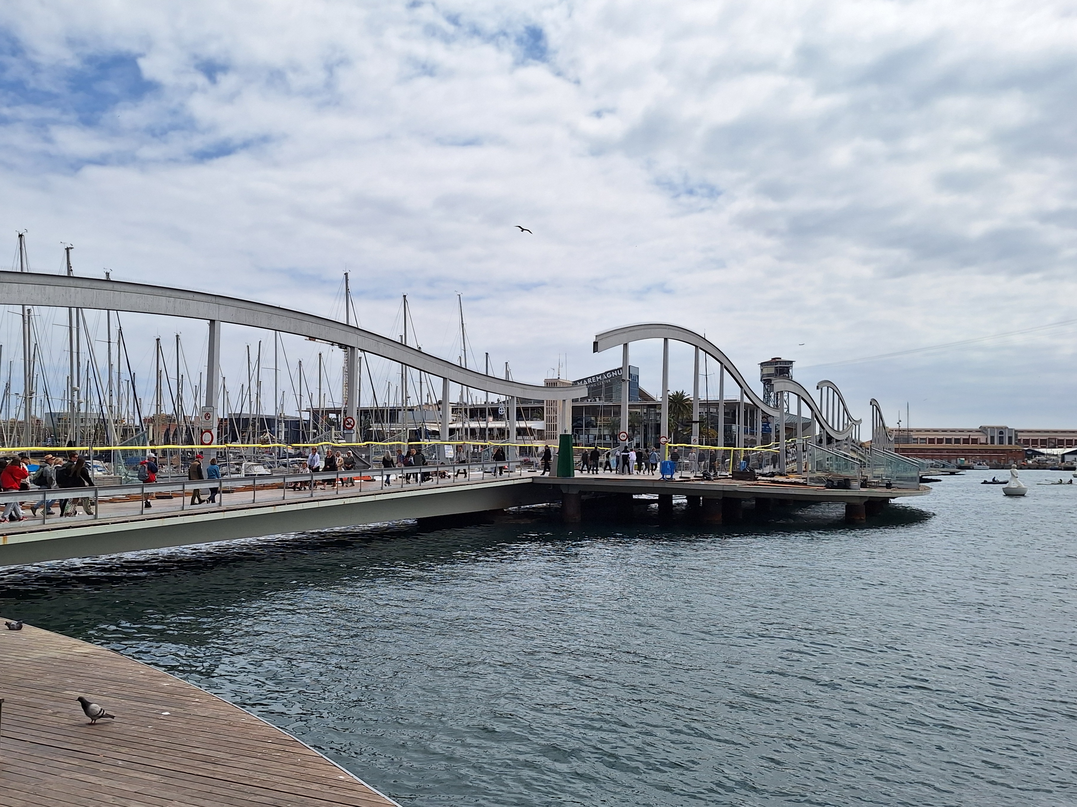 Vor mir liegt die Pont Mòbil, die hölzerne Drehbrücke zum Maremagnum. In ihrem aktuellen Zustand hat dieses „hölzerne Etwas“ den Charme einer abenteuerlichen Flussüberquerung in Nepal – nur ohne Gebetsfahnen, dafür aber mit Absperrgittern, deren Rost mittlerweile schon eine recht beachtliche Patina angesetzt hat. Es ist ein faszinierendes Provisorium: Ich schwanke über das Holz und wähle meine Schritte sehr bewusst zwischen den beschädigten Holzplanken.